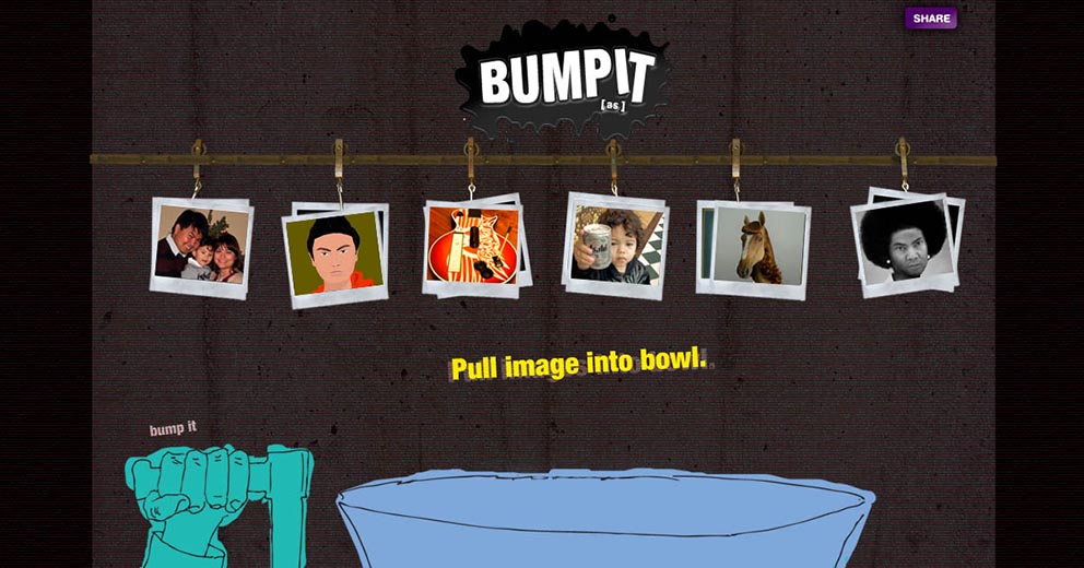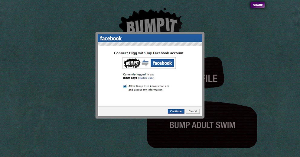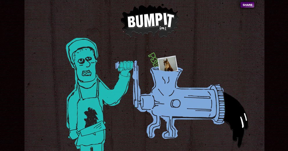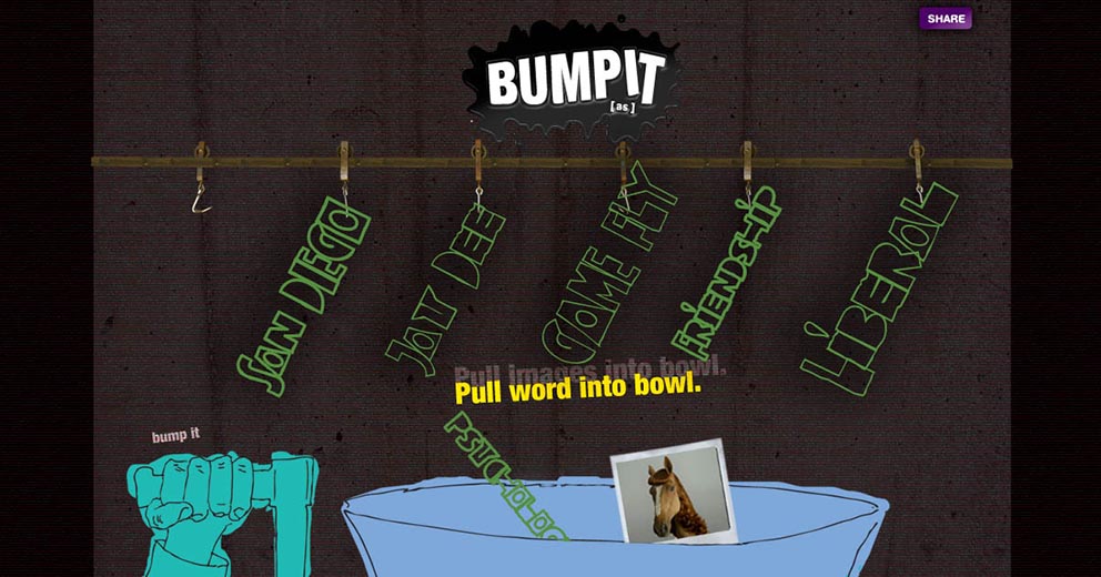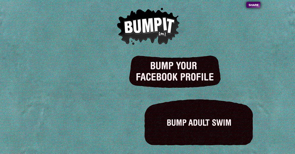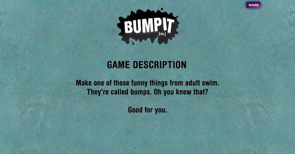 This web app allows users to generate their own [as] “bump” to share with the world. (A “bump” is a short piece of content that combines words and small graphics to tell a 10-30 second mini story of a nonsensical nature. There is music [not mainstream music] playing in the background and they all conclude with the adult swim logo). Users can build one on the adult swim website using default content or they can create one using content extracted from their Facebook profile. When generating a bump, interface elements take users on a journey through the sausage making process that's ridiculously adult swim.scope: art direction, naming, game concept, ad campaign, visual design, desktop/mobile UX/UI, video