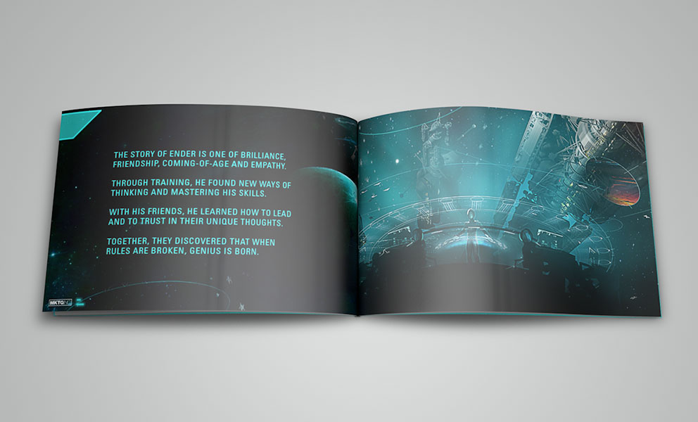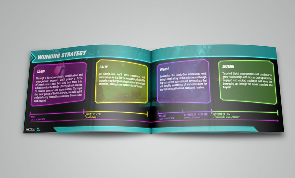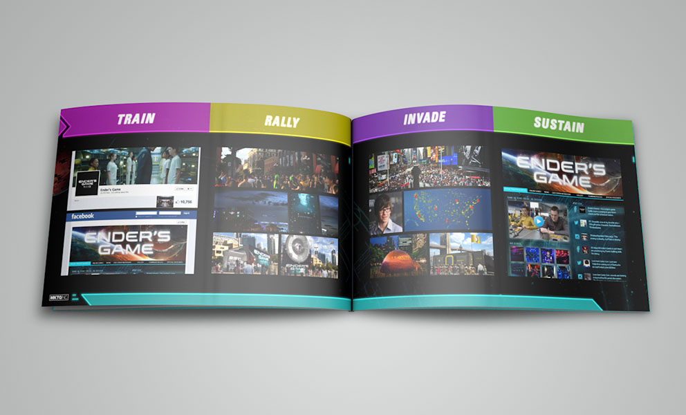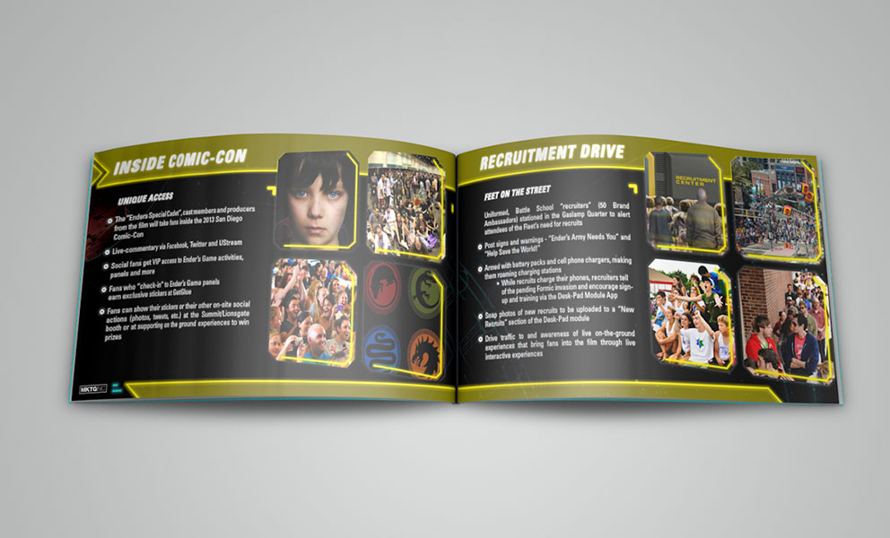 I was asked by MKTG to produce a pitch deck showcasing experiential concepts that would ultimately build anticipation for the movie Ender’s Game prior to its theatrical release. Efforts were made to keep the design thematically consistent with the film's storyline to fully express the authenticity of experiential concepts. In a weeks time this project went from concept to completion and was warmly received.scope: art direction, visual design, print, production